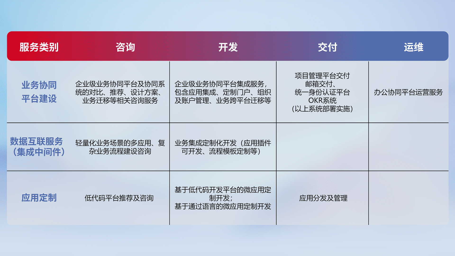 针对钉钉、、、企微、、、、IDaas等平台级产品提供产品的规划、、、、方案、、、、交付、、、、定制化开发等服务,,,,实现如统一协同办公、、、智能客户服务、、、混合会议管理、、智能数据查询、、、等业务场景,,实现数字化转型。。。。