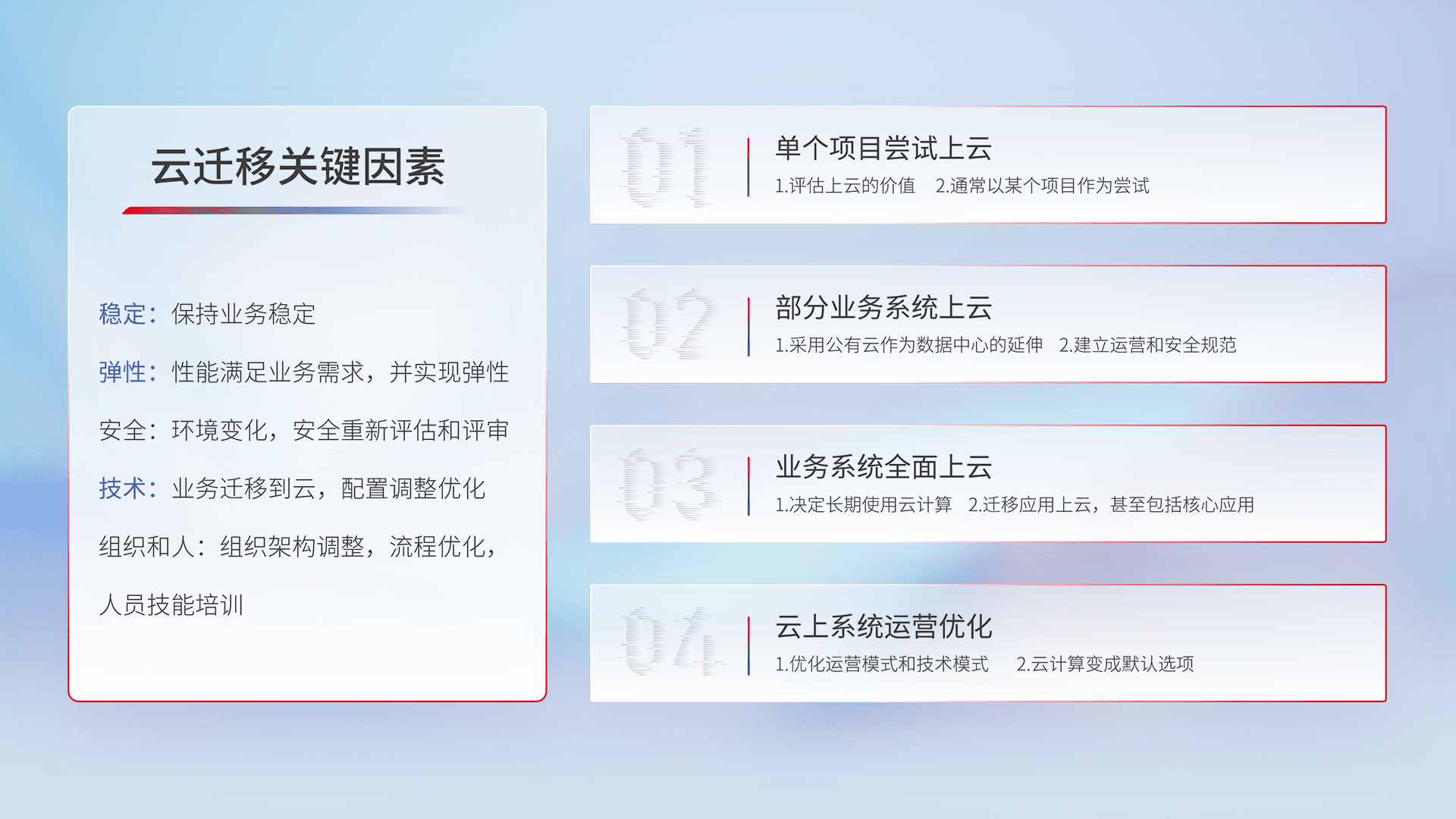 结合实际业务,,,,从规划设计、、云平台选型、、、、云原生改造、、、数据迁移、、、、集成交付,,,,迁移全过程为客户识别最佳上云路径,,,,做好风险识别管理,,设计网络架构、、、、身份权限、、、安全审计合规、、操作审计、、日志审计、、、、监控告警策略、、、多站点容灾设计等,,,,对云上基础设施进行整体规划,,提升IT治理水平,,,以满足弹性、、高可用、、高性能的需求。。。。