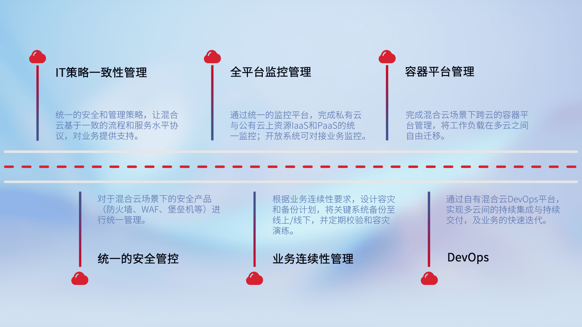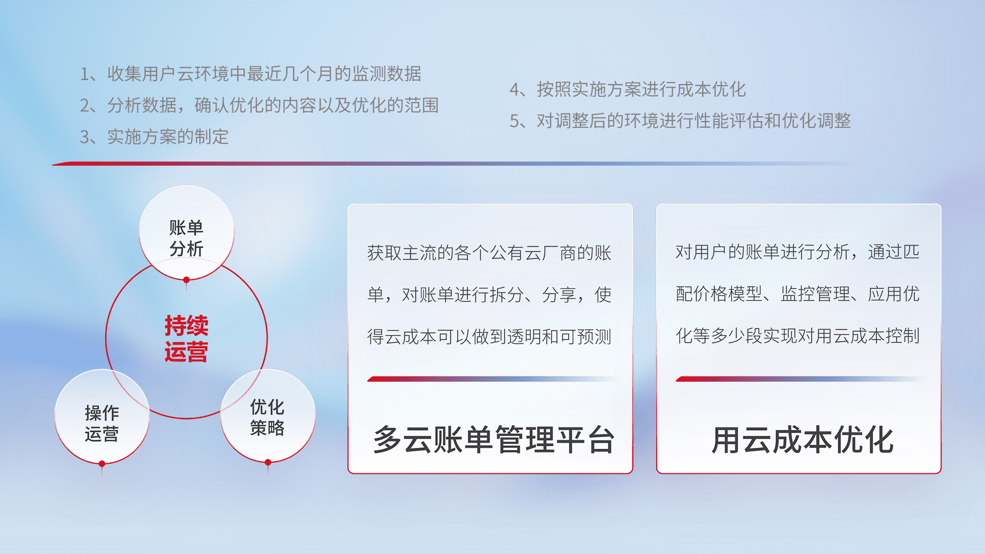 通过多云纳管,,以统一的资源数据模型把客户的云资源进行抽象和封装,,进而实现对多云资源的统一操作,,,,保障云资源管理的可靠性、、稳定性与可用性。。。量身定制化运维内容,,,配置、、开发运维、、、补丁管理、、备份、、、、监控、、认证和访问管理、、、审计和日常巡检等,,保障在用云过程中的可靠度,,,稳定度以及高可用率。。